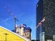 En devenir. Mais quelle vue depuis le pied de l’Arche ! Le vaste espace entre le Centre commercial des Quatre-Temps et le Cnit est quasiment vide, sauf quelques piétons minuscules qui s’autoportraitisent, sauf également quelques jeunes gens qui font admirer à deux ou trois supporteurs et supportrices leurs exploits sur une planche à roulettes. Le regard porte loin, c’est reposant pour la vue d’accommoder au punctum remotum. La perspective s’étrécit dans la distance entre deux enfilades de constructions et de tours, toutes différentes. Un vrai musée de l’architecture moderne. Un musée en construction permanente si j’en juge par les nombreuses flèches rouge et blanc des grues qui rayent et balayent le ciel bleu. Chaque fois que je viens il y a du nouveau. J’aime bien les choses en devenir. Je vais faire quelques photos graphiques et colorées avec ces grues, des images proches de l’abstraction. À propos de musée, il y a d’autres œuvres que le pouce de César en plein air sur la dalle. Pas loin de soixante-dix, je crois. Je ne suis pas certain de les repérer toutes sans un guide. Il faudra que je télécharge l’appli qui propose des parcours de découverte. Un jour. Aujourd’hui je me balade sans objectif défini, sauf celui de mon photo-phone.