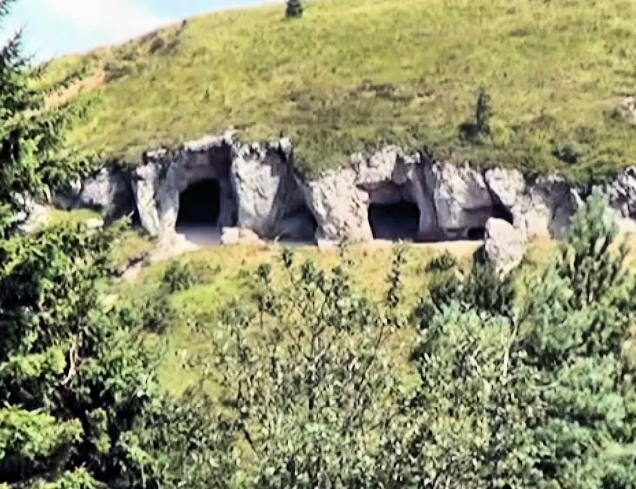 Juste sous le sommet on aperçoit une partie un peu plus abrupte où la lave n'est pas couverte par l'herbe. Sur le flanc sud (à droite), au niveau de cette portion dénudée, on trouve des "grottes". Elles sont détaillées dans les photos qui défilent ci-dessus. Ce sont en fait d'anciennes carrières d'où l'on a extrait une partie du matériau ayant servi aux Romains à l'édification, au cours du 2ème siècle, du temple de Mercure situé au sommet du Puy de Dôme. On trouve également des "grottes" (d'anciennes carrières ) sur le volcan voisin situé à l'ouest du Clierzou, le Petit Suchet et aussi sur le Grand Sarcoui, situé plus au nord et à l'est, près de la faille de Limagne.